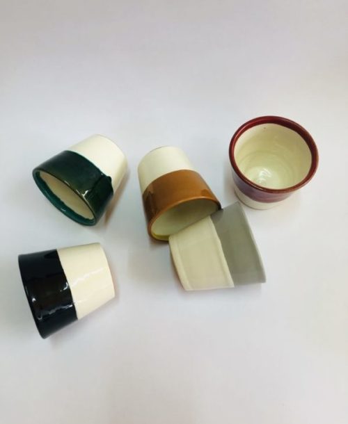 Per adesso mi limito alla versione rosso porpora (che sta benissimo nel mio bagno utilizzato come porta spazzolino) e giallo ocra, oltre che a quelli classici. Sono tutti interamente realizzati a mano in terracotta e smaltati con smalti naturali privi di piombo, produzione artigianale Made in Salento.
