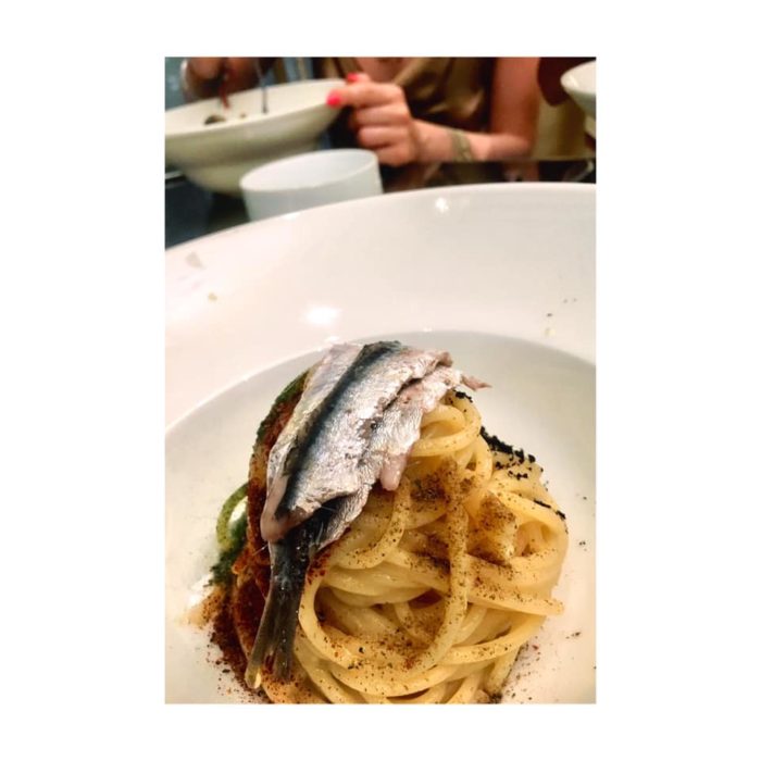 Grande scoperta suggeritaci da una nostra cara amica, per una cena di inizio estate (ormai era già l’8 agosto) siamo andate a provare Pesciolino. Oltre ad essermi innamorata del posto (a breve infatti sarà sfornato un articolo a tal proposito), mi sono letteralmente persa con un piatto di pasta semplicissimo ma dai sapori esplosivi: Ajo e ojo mare nostrum ossia spaghettoni Pastificio Felicetti – alici affumicate alla brace – polvere di olive, capperi, peperone crusco, prezzemolo e limone. Un boccone e mi son sentita subito a cena a Favignana, rigorosamente in barca, ancorata in qualche caletta a mangiare a lume di candela.