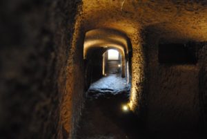 Già la prima particolarità che risalta subito all’occhio del visitatore curioso di esplorare e assaporare, è il fatto che la cantina sorge su delle antiche tombe risalenti all’epoca etrusca. Infatti, dopo la scoperta di questo tesoro artistico, il proprietario ha sapientemente fatto rivoluzionare il progetto preservando la storia, lasciando i vecchi cunicoli funerari intatti e visitabili.