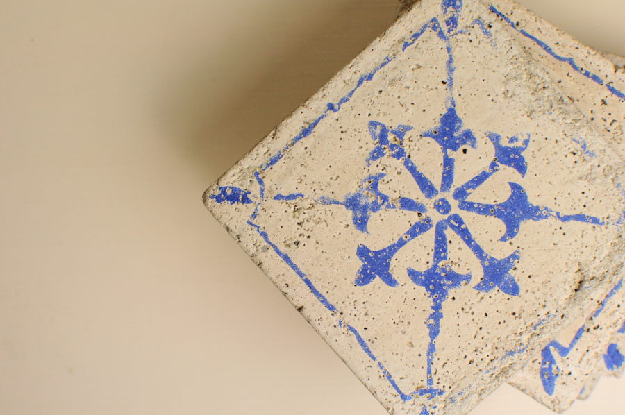 una cosa che adoro fare è arredare pezzettino per pezzettino la mia dimora al Circeo. Questo mese mi sono innamorata di un quartetto di sottobicchieri in cemento del marchio —- : stile “vissuto” con le maioliche (altra fissazione) dipinte disegnate sopra, fintamente rovinate.