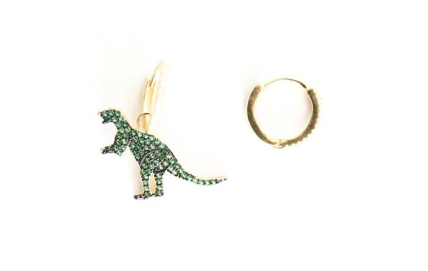 Un paio di cerchi bagnati in oro e tempestati di zirconi sostengono un ciondolo a forma di dinosauro. E indovinate? È tempestato di zirconi anche lui. La cosa bellissima è che il dinosauro simboleggia tantissime qualità, come il coraggio, la forza, la nobiltà d’animo, il potere. È adatto a tutte quelle fanciulle che hanno bisogno di ricordarsi che ce la possono fare è che hanno la capacità di lasciarsi alle spalle il passato è guardare al futuro.
