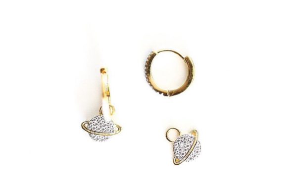 Due bellissimi cerchietti bagnati in oro e tempestati di zirconi, con due ciondoli a forma di Saturno. Oltre a ad essere carinissimi, la cosa che ci piace di più è che ci ricordano il nostro legame con la natura. In più Saturno definisce i nostri confini e le nostre vite. Un monito sicuramente più persuasivo dell’oroscopo di giovedì di Rob Brezsny.