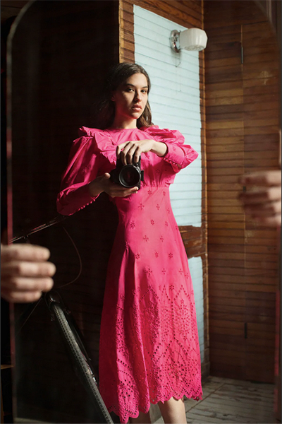 Vestito midi con collo rotondo e maniche lunghe a sbuffo. Dettaglio di volant e ricami traforati abbinati tono su tono. SENTITI MERAVIGLIOSAMENTE BELLA!