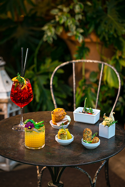 L’esterno prevede tavolini sparsi qua e la, apprecchiamento semplice e curato, piante ovunque, luce soffusa che ci avvolge e ci fa sentire in pace.