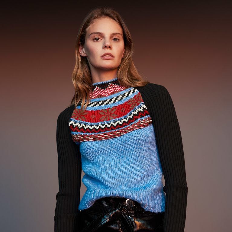 Immaginatevi la scena. Baita, fuoco che scoppietta nel camino, un bicchiere di vino rosso. E cosa manca? Ma questo maglione di MAJE addosso, ovvio. Adoriamo il suo tessuto morbido, l’accostamento tra rosso e azzurro e questo ricamo natalizio sul collo. Pronte ad infilarlo in valigia per la settimana bianca?