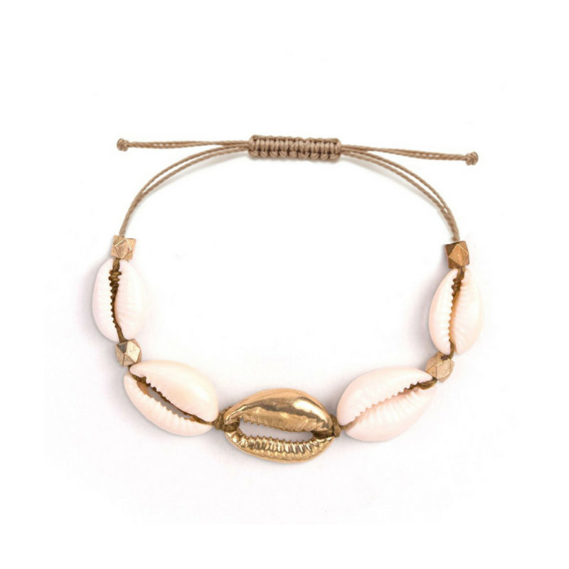 Cosa vi manca in valigia? Che domande questo bracciale – con chiusura regolabile e conchiglia dorata – perfetto per l’estate. La cosa che ci piace è che si può utilizzare anche come cavigliera.