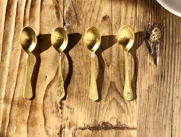 Sto parlando di un bellissimo set di cucchiaini in ottone, ognuno diverso e con una scritta che è un inno al buonumore a al relax.