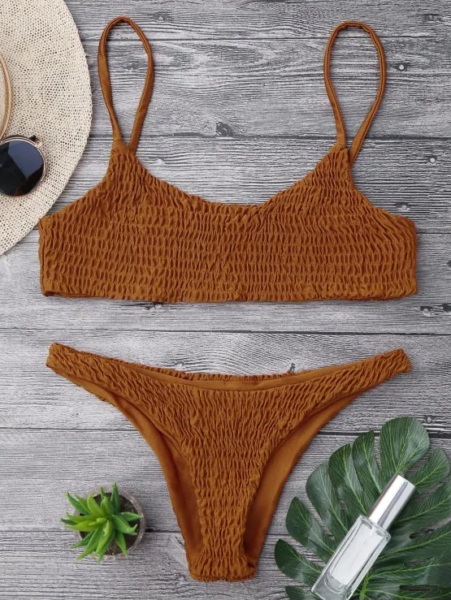Questo due pezzi color tabacco, modello Bikini Top Smock e Bottoms ce lo vediamo addosso, con sopra un camicione di lino bianco, perfetto per girare fra i vicoletti di qualche paesino, sperdute fra le isole greche, alla ricerca di un gin tonic dopo una giornata di mare.