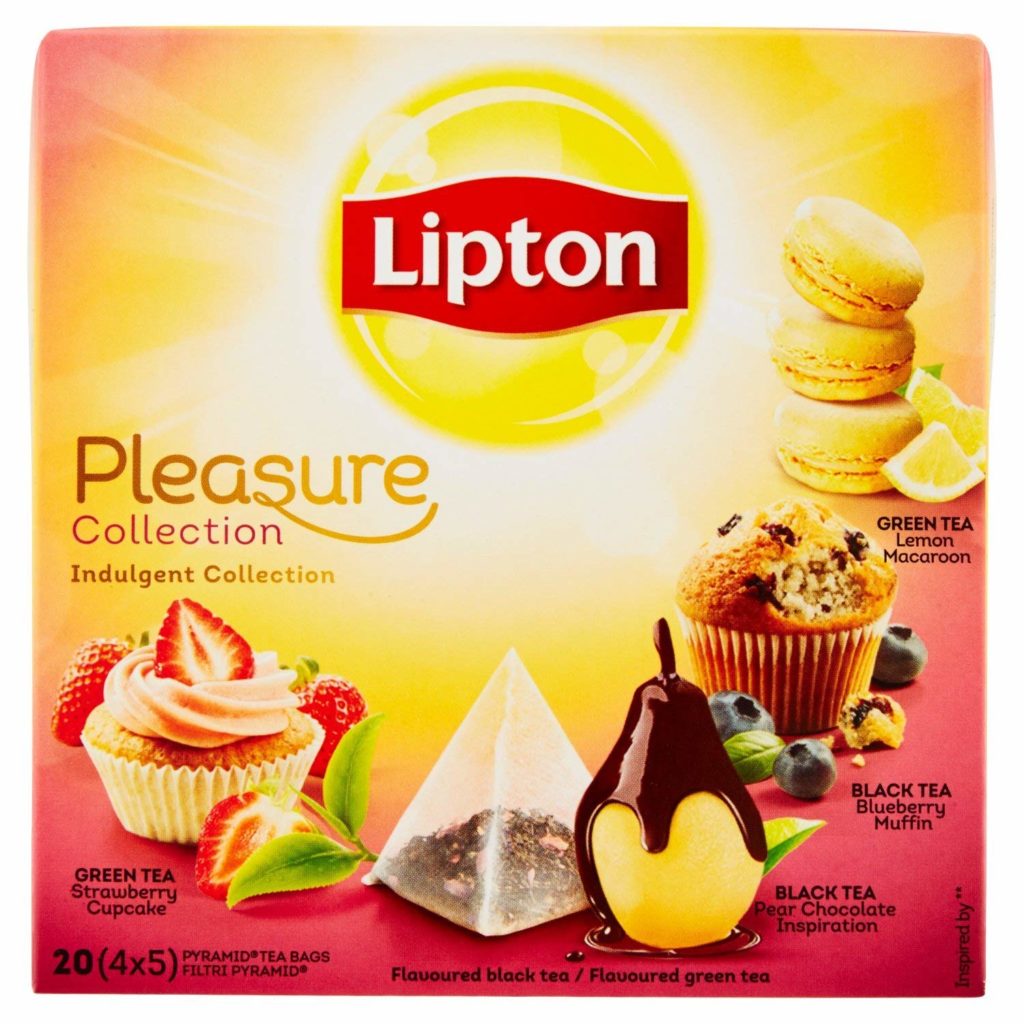Per una tazza così strana, ci vuole un tè ancora più strano e dai gusti particolari. La Lipton ha creato questa scatola delle meraviglie con i gusti più particolari ed impensati, diciamo solo Muffin con i mirtilli ! (sa veramente di muffin, provare per credere)
