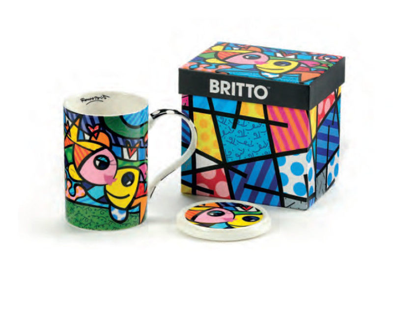 Nelle tazze come nella vita ci vuole un pizzico di stravaganza e colore, tanto colore è per questo che ci siamo innamorate delle creazioni di Romero Britto, un artista stravagante che si diverte a giocare con le forme e con i colori. In più il coperchio, che diventa anche sottobicchiere è una vera chicca.