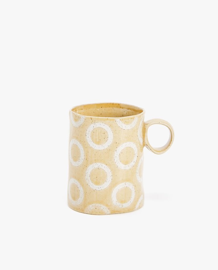 Ce ne siamo immediatamente innamorate per la forma irregolare, per il giallo ocra e per i tondini bianchi che fanno allegria.