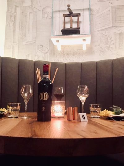 Il nuovo ristorante dello chef Rossano Boscolo ( per chi si fosse perso la nostra descrizione del posticino, lo trovate qui) è stato la cornice di una degustazione i vini di punta della cantina orvietana. Oltre al buon cibo e al buon vino, protagoniste indiscusse della serata sono state le bottiglie con le loro meravigliose etichette, una diversa dall’altra, con disegni ispirati ai monili funerari di epoca etrusca ritrovati all’interno della necropoli sulla quale la cantina sorge.