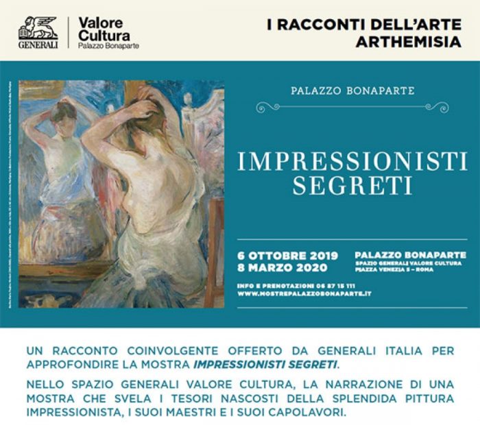 La mostra è all’interno di Palazzo Bonaparte, un meraviglioso edificio barocco sito in Piazza Venezia, divenuto di proprietà di Generali. L’esposizione vanta oltre 50 opere di artisti tra cui Monet, Renoir, Cézanne, Pissarro, Sisley, Caillebotte, Morisot, Gonzalès, Gauguin, Signac, Van Rysselberghe e Cross. Si tratta di tesori nascosti al più vasto pubblico (per questo “segreti”), in quanto provenienti da collezioni private raramente accessibili e concessi eccezionalmente e unicamente per questa mostra.