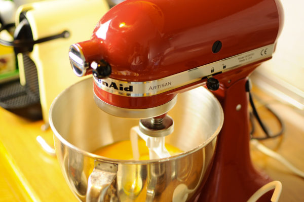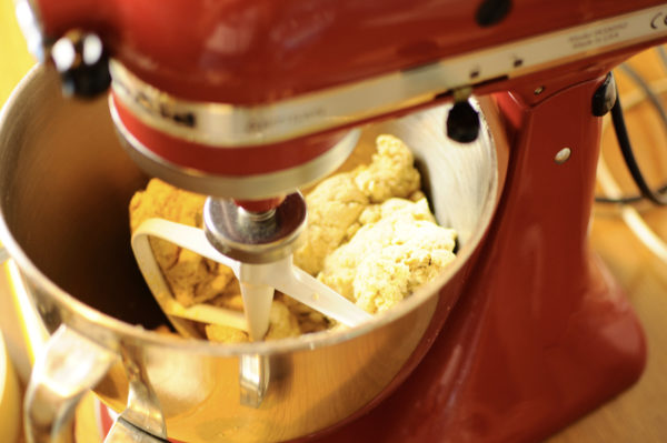 Avviare la planetaria con la foglia ad una velocità moderata. Quando il composto comincia ad amalgamarsi, aggiungere a filo il vino bianco secco, fino a che non si ottiene un composto omogeneo.