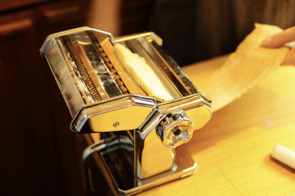 Una volta steso, dividerlo in rettangoli della dimensione adatta a poter essere steso con la nonna papera. Passare il rettangolo di pasta prima spostando la rotella sulla “misura 1” un paio di volte, per poi passarlo nuovamente con la rotella sulla “misura 4”.